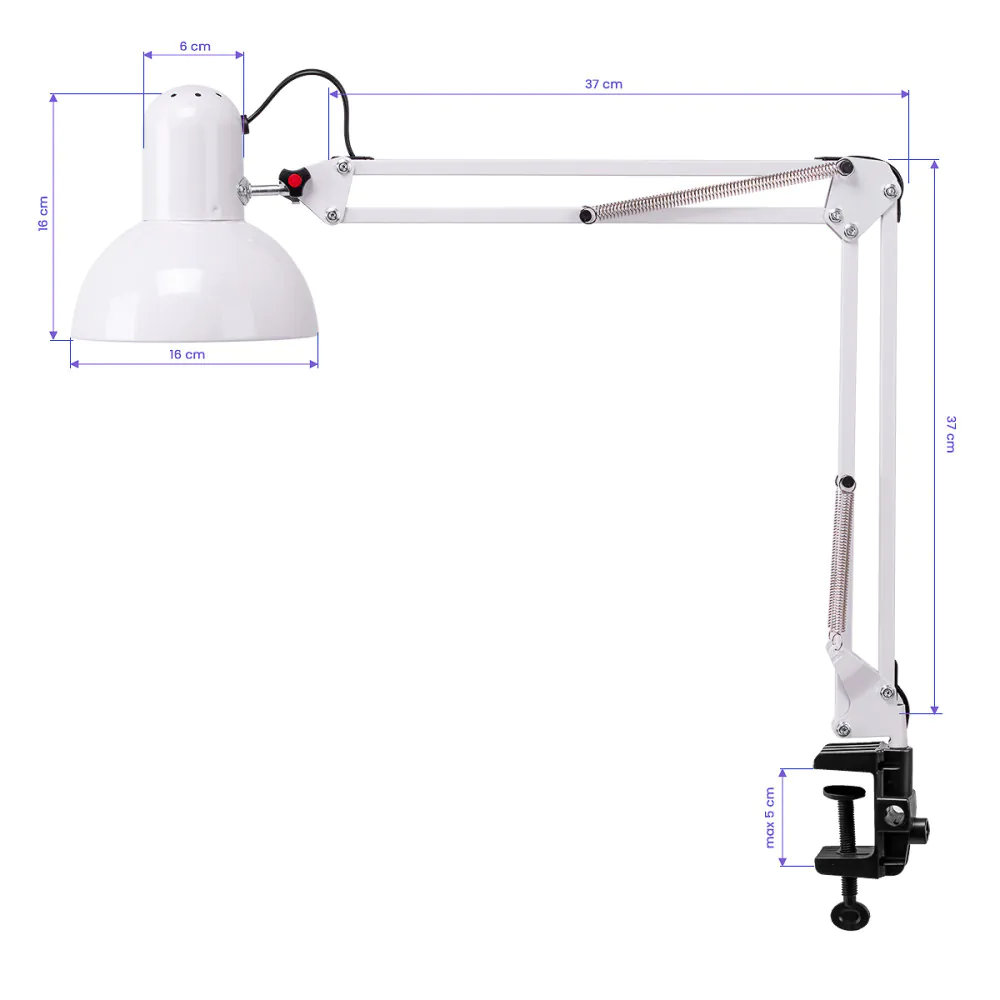 Lampa zabiegowa PiX 314 z możliwością montażu do blatu została zaprojektowana z myślą o wygodzie użytkowania. Dzięki regulowanemu stelażowi zapewnia doskonałe oświetlenie podczas precyzyjnych zabiegów, idealnie sprawdzając się w profesjonalnych gabinetach, gdzie odpowiednie światło jest kluczowe dla jakości usług – takich jak stylizacja paznokci, pielęgnacja czy makijaż. Doskonale sprawdzi się również podczas przygotowywania materiałów na social media – robienia zdjęć czy nagrywania wideo efektów pracy. Należy pamiętać, że żarówka nie jest dołączona do zestawu, co pozwala na dobór modelu najlepiej dopasowanego do indywidualnych potrzeb. Wystarczy wybrać żarówkę z gwintem E27 o maksymalnej mocy 60 W, aby w pełni wykorzystać funkcjonalność lampy.