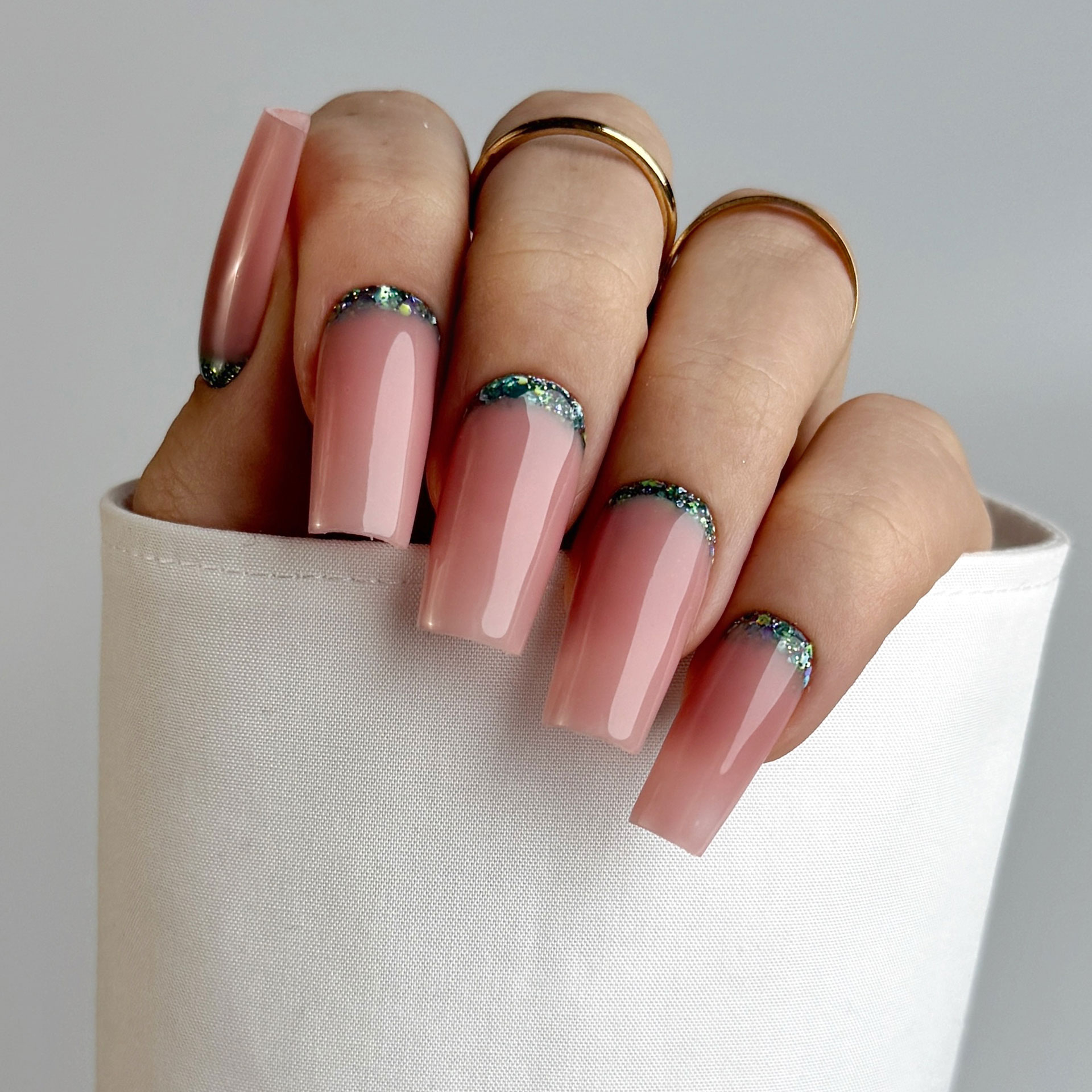 Nałóż cienką warstwę żelu na zmatowioną powierzchnię lub top no wipe, rozmieść cekiny według uznania, utwardź w lampie LED przez 60–90 sekund, a następnie zabezpiecz topem. Dla mocniejszego efektu możesz nałożyć kolejną warstwę lub punktowo zagęścić błysk w wybranym miejscu.