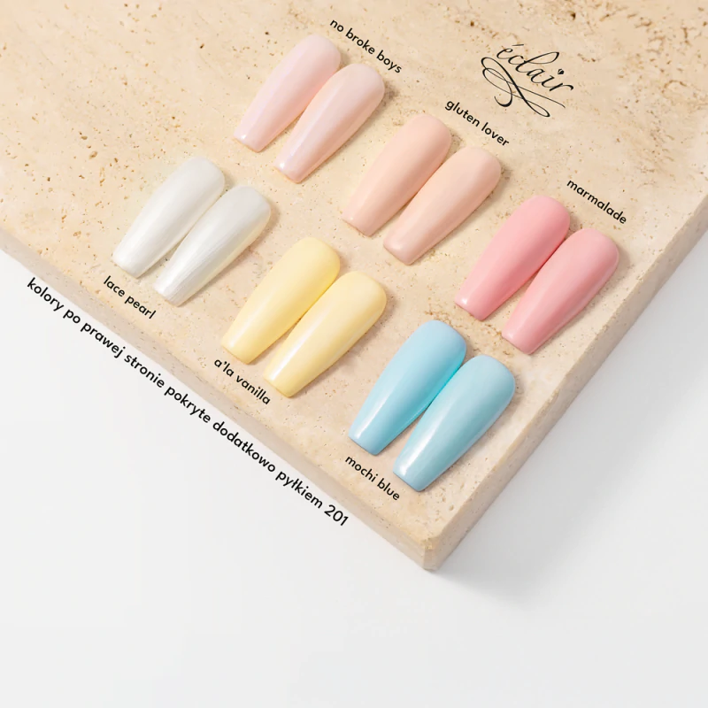 Paleta zestawu obejmuje zarówno kolory neutralne i klasyczne – GLUTEN LOVER, LACE PEARL – jak i bardziej charakterne pastele z wyraźnym odcieniem: MARMALADE, A’LA VANILLA, MOCHI BLUE. NO BROKE BOYS jako jedyny wprowadza efekt drobinki, co daje dodatkową możliwość stylizacyjną w obrębie zestawu.