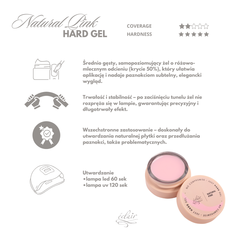 Po zaciśnięciu tunelu, Natural Pink żel budujący nie rozpręża się po ponownym włożeniu do lampy. To oznacza, że możesz uzyskać jeszcze lepsze efekty i trwalszy manicure, niż zwykle. Co więcej, Natural Pink żel budujący należy do żeli twardszych, co czyni go idealnym wyborem dla osób, które mają kruche i łamliwe paznokcie, a także dla osób z problematycznymi paznokciami.