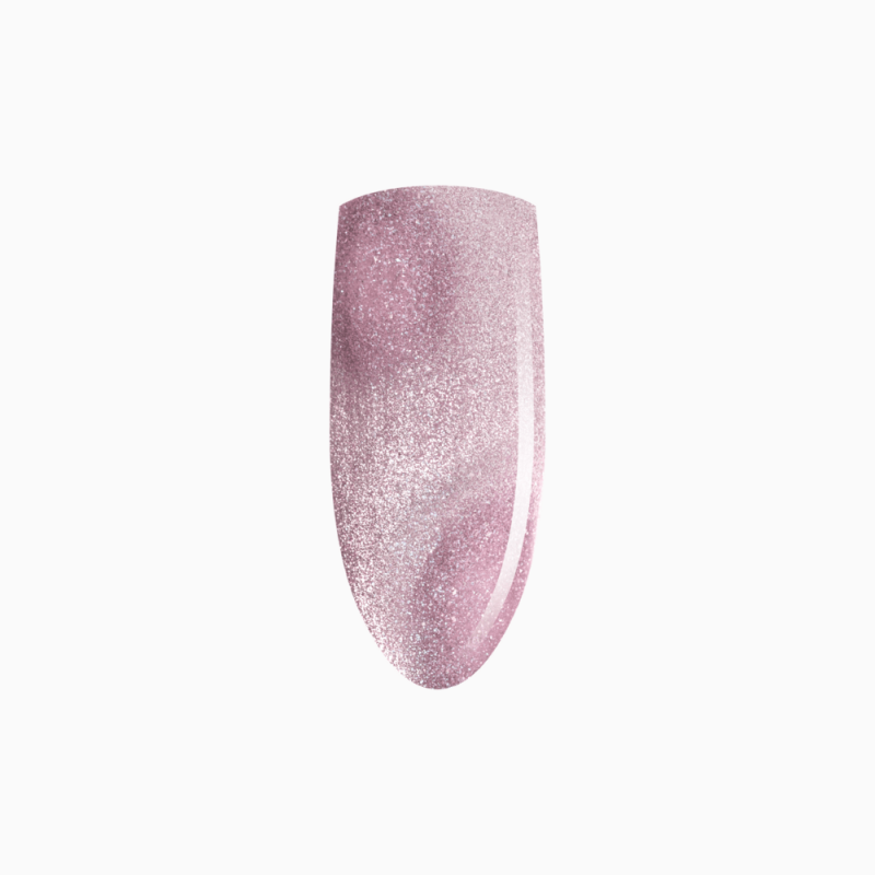 Złote drobinki w tym lakierze są lekkie i świetliste. Ich rola to podbić refleks, a nie zdominować całą stylizację. W połączeniu z wykończeniem cat eye powstaje magnetyczna smuga światła, która buduje głębię i daje efekt wielowymiarowości. Manicure zmienia się kątowo: raz bardziej widać złoty akcent, innym razem chłodną bazę i różową nutę.
