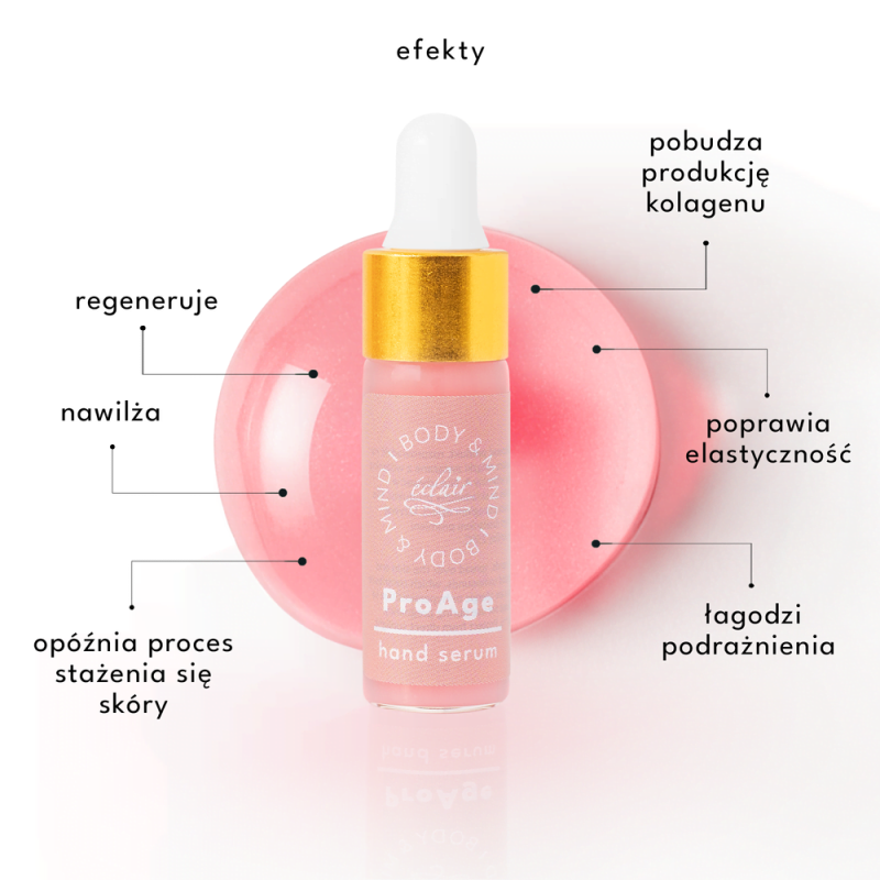 Dłonie są jak wizytówka stylistki i klientki: zdradzają tryb życia, tempo dnia, kontakt z detergentami, zmianami temperatur i częstym myciem. Właśnie dlatego ProAge Hand Serum 5ml od Eclair Body & Mind powstało jako produkt ukierunkowany na potrzeby skóry, która z dnia na dzień traci komfort, staje się szorstka, przesuszona, bywa zaczerwieniona i szybciej pokazuje oznaki starzenia. To nie jest „kolejny krem do rąk”, tylko skoncentrowane serum o nastawieniu na intensywną pielęgnację: nawilżenie, regenerację i ochronę w jednym, lekkim kosmetyku, który wspiera świeży, zadbany wygląd skóry.