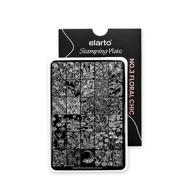 Płytka do stempli elarto Stamping Plate No. 3 Floral Chic to prawdziwa gratka dla miłośniczek i miłośników kwiatowych zdobień, kwintesencja elegancji i florystycznego bogactwa. Zawiera dziesiątki bogato grawerowanych wzorów w stylu full cover, inspirowanych kwiatami, liśćmi i roślinnymi ornamentami – od subtelnych pąków i pojedynczych gałązek, przez ozdobne wieńce i układy symetryczne, aż po efektowne zdobienia o bujnej, dekoracyjnej strukturze. Blaszka elarto Stamping Plate No. 3 Floral Chic umożliwia tworzenie efektownych stylizacji o artystycznym charakterze, pełnym lekkości i kwiatowego wdzięku. Do blaszki dołączony jest szablon demonstracyjny z rzeczywistymi rozmiarami wzorów, który pozwala sprawdzić, jak dany motyw będzie wyglądał na paznokciu i czy zmieści się na konkretnej płytce.