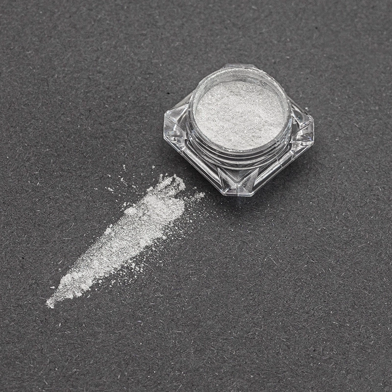 Ten niezwykle drobniutki pył, a właściwie puder, w srebrzysto-perłowym kolorze pozwala uzyskać efekt opalizującej tafli na paznokciach, jednocześnie dając piękne wykończenie w stylu chrome.