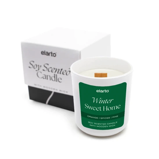 Zapachowa świeca sojowa elarto Winter Sweet Home to rodzinne wspomnienia pełne aromatów przypraw korzennych, dopełnionych nostalgicznymi nutami cynamonu, ze szczyptą złocistej, słodko-kwaśnej pomarańczy i słodkiego, soczystego jabłka. Do pomieszczenia wprowadza ciepły i świąteczny nastrój, tradycyjny zapach choinki i Świąt, idealny na zimowe dni. Świeca elarto Winter Sweet Home została wykonana z naturalnego wosku sojowego, ma drewniany knot. Podczas palenia radośnie tańczący płomień, wydaje bardzo przyjemny, kojący dźwięk skwierczącego drewna. Całość w białym, szklanym słoiczku oraz ozdobnym pudełku. Łączny czas palenia świecy to około 36 godzin.