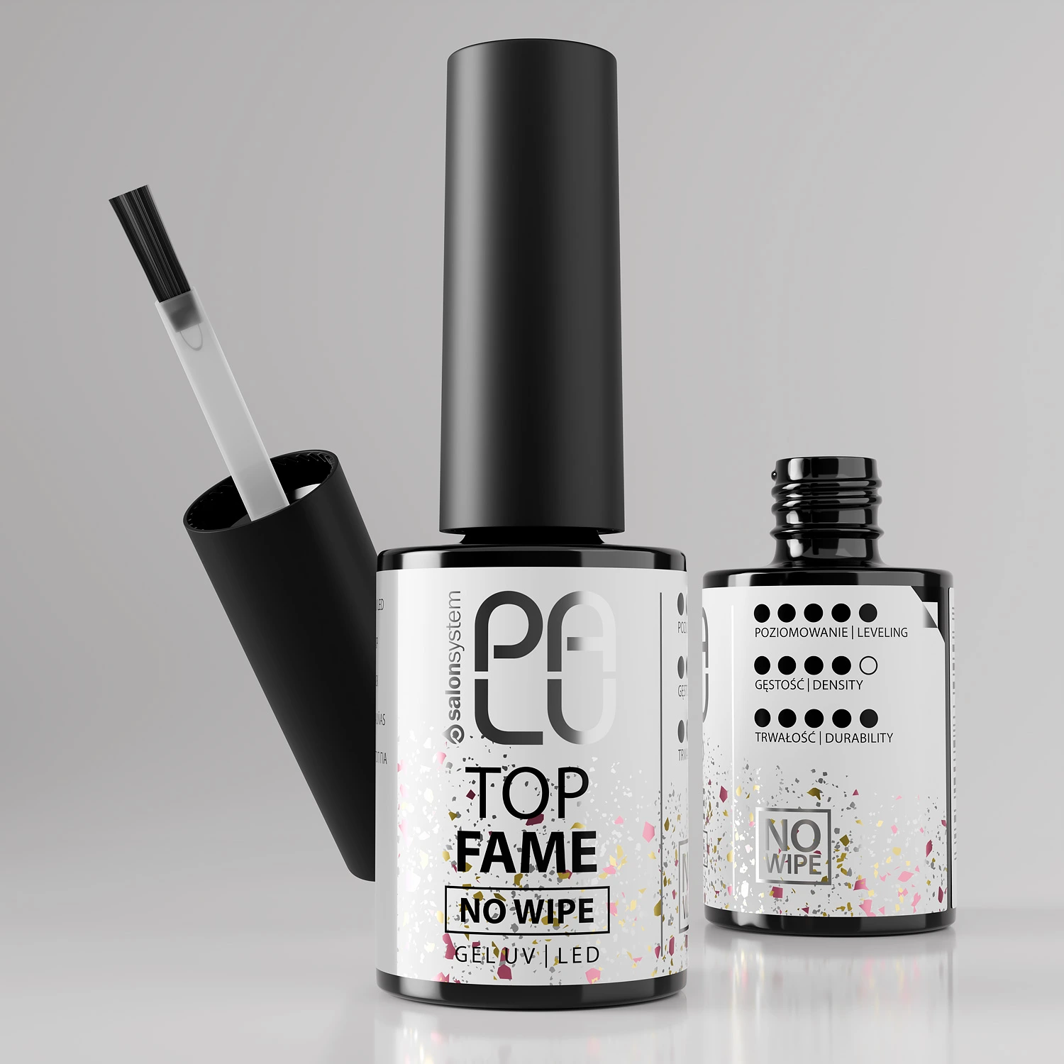 Na gotową stylizację nałożyć Top. Po utwardzeniu w lampie należy odczekać około minuty przed nałożeniem oliwki. Produkt nie pozostawia warstwy inhibicyjnej.